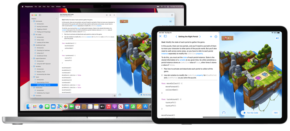 เมื่อเปิดแอปพลิเคชัน Swift Playgrounds ขึ้นมาจะพบกับแถบด้านล่างหน้าจอที่เต็มไปด้วย Playgrounds หรือก็คือคู่มือที่เราสามารถเล่นและทดลองกับการเขียนโค้ด หนึ่งในคู่มือที่เหมาะสำหรับมือใหม่ก็คือคู่มือ “เริ่มต้นใช้ด้วยการเขียนโค้ด” เราจะได้เรียนรู้วิธีการเขียนโค้ดคำสั่งเพื่อนำทางตัวละครในเกมส์ที่ชื่อว่า Byte ไปเก็บเพชรที่กระจัดกระจายอยู่ตามเกาะลอยฟ้า ผู้เล่นจะได้ความเข้าใจเกี่ยวกับโค้ดต่างๆมากมาย ไม่ว่าจะเป็น ตัวแปร, ลูป, หรือ ฟังก์ชั่น